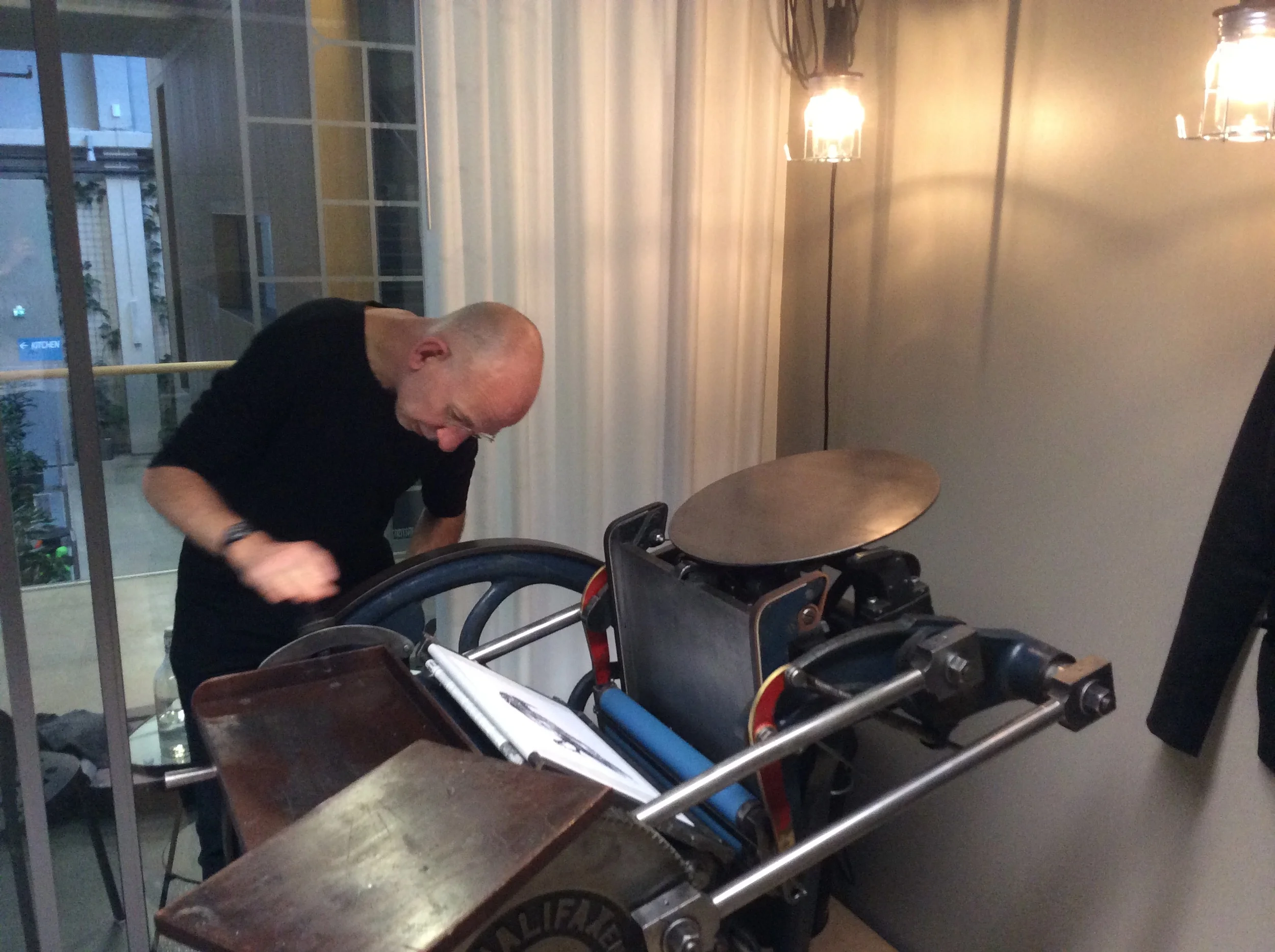 Thomas Gravemaker (Letterpress Amsterdam) tuli vierailulle Turkuun. Kolmenpäivän aikana säädimme photopolymeerilaattojen valotus-/pesukoneeni, painokoneen musterullat, puristuksen ja tietenkin painoimme mustetta paperille. Auringon laskettua söimme ansaitusti hyvin Mamin, Sergion ja Tintån antimia muutaman lasillisen kera.